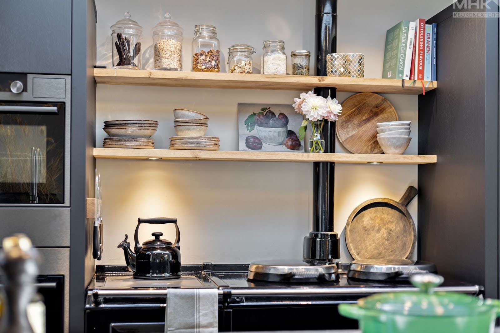 In plaats van bovenkasten die je keuken kleiner doen lijken, kun je kiezen voor open planken. Dit geeft een luchtige, ruimtelijke uitstraling en biedt genoeg plek voor je dagelijkse keukenspullen. Bovendien kun je er je mooiste servies, kruidenpotjes of kookboeken op kwijt, wat zorgt voor een persoonlijke en gezellige sfeer.